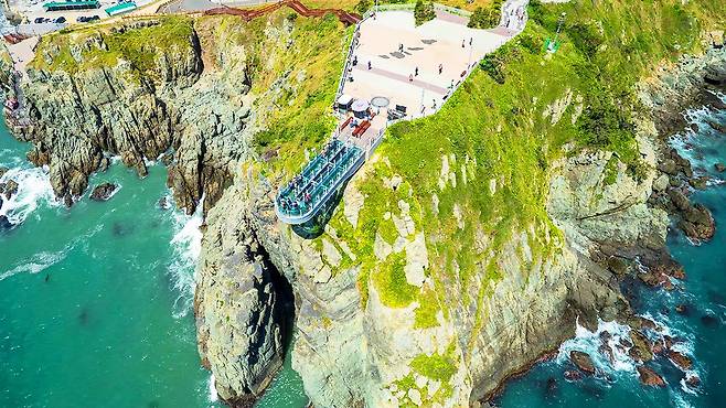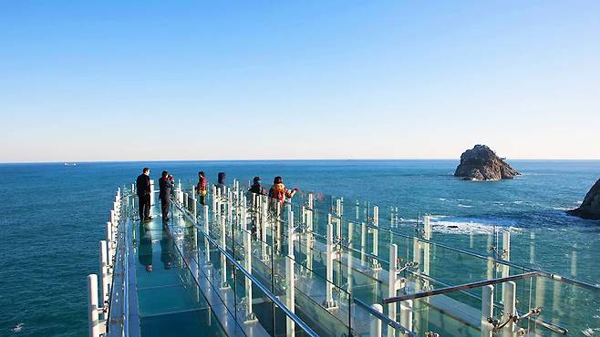 유리판 아래로 절벽과 바다가 드러나며 짜릿한 긴장감을 주고, 날씨 좋은 날에는 대마도까지 조망이 가능합니다.