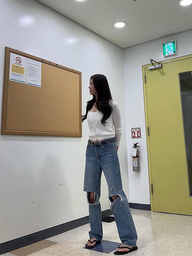 게시판 앞에서도 당당한 장신영의 아우라가 시선을 강탈한다. 군더더기 없는 흰색 슬림핏 톱에 과감한 찢청을 매치한 그의 룩은 캐주얼하면서도 과감한 무드를 동시에 자아낸다. 특히 오버사이즈 데님 팬츠의 무릎 컷아웃 디테일이 단연 눈에 띈다.