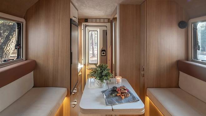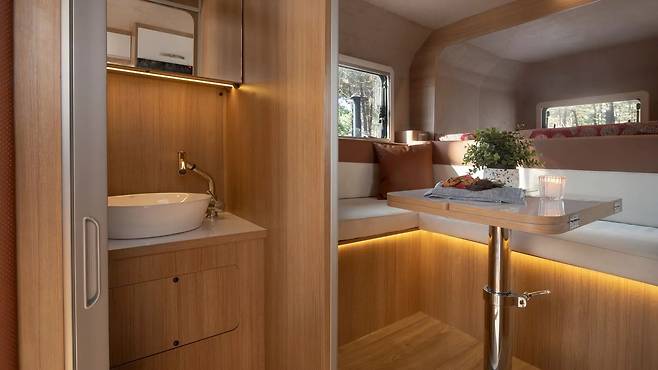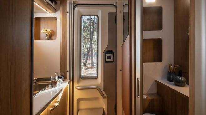 내부 역시 의외로 고급스럽다. 총 여섯 가지 레이아웃 중 선택이 가능하며, 밝은 톤의 우드 베니어 마감과 간접조명이 조화를 이뤄 유럽형 캠핑카 스타일을 떠올리게 한다. 후면 도어를 통해 들어가면 우측에 주방 블록, 좌측에는 화장실 공간이 배치돼 있다. 화장실은 두 부분으로 나뉘며, 한쪽은 변기와 수납 선반, 다른 쪽은 세면대와 추가 수납공간으로 구성돼 있다.