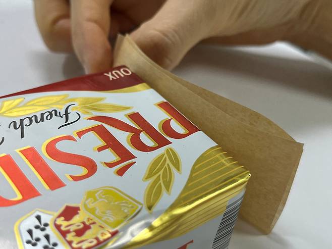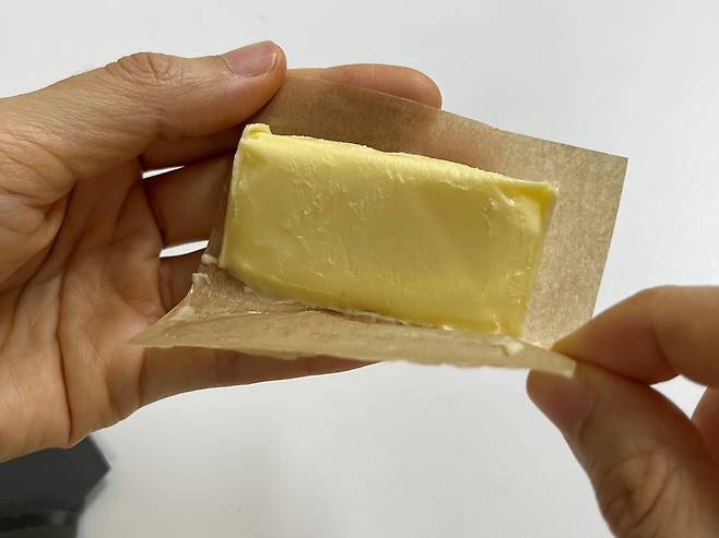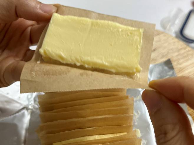 버터 사이사이에 낀 종이호일을 하나씩 떼어내면 이렇게 버터가 함께 따라 올라오는데요. 이때 뒷면을 앞쪽으로 가져와 버터를 감싸줍니다.