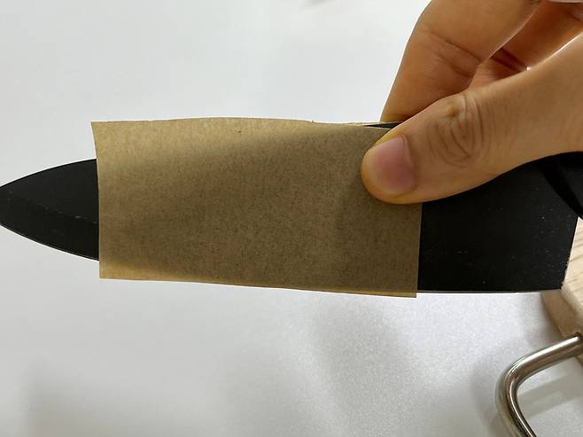 이렇게 자른 종이호일을 칼에 감쌉니다.
