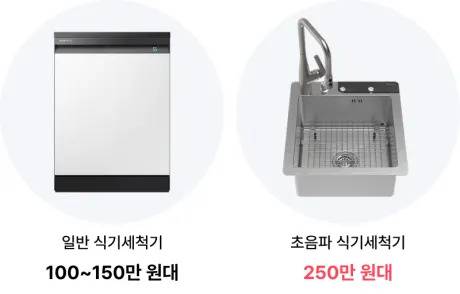 초음파 식기세척기는 일반 식기세척기 2대를 구매할 수 있는 가격대을 가지고 있으며, 가장 작은 사이즈가 250만원부터 시작하여 300만원 후반대의 가격을 가지고 있습니다.