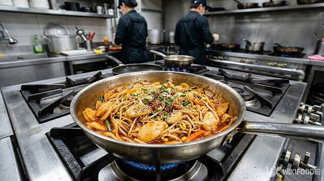 이때 전체를 골고루 섞어 주면 양념이 떡과 콩나물에 고르게 배어든다. 마지막에 센 불에서 볶으면 국물이 줄어들고 양념이 재료에 달라붙는다.
