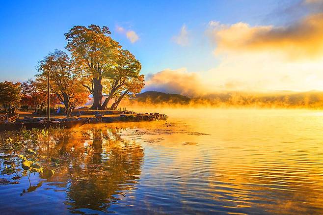가을이 되면 두물머리의 아름다운 은행나무와 단풍나무들이 붉고 노랗게 물들어 그림 같은 풍경을 만들어냅니다.