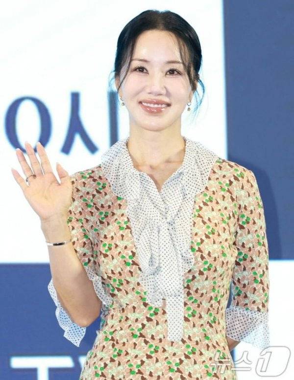 엄정화의 헤어는 단정한 로우번 스타일로,