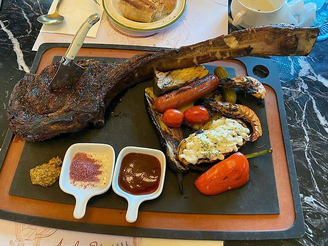 풍미가득한 초대형 숯불 스테이크가 있는 '곡성가든'. 시간과 정성을 들여 구워내는 스테이크로 30~40분의 조리시간이 소요된다. 1200g의 초대형 토마호크 스테이크는 비주얼부터 압도적이다. 통으로 나오는 스테이크는 직원이 직접 테이블에서 잘라주며 부위와 먹는 순서를 설명해준다고. 적당히 잘 익은 스테이크는 육즙이 그대로 살아있고 부드럽게 씹힌다. 여러가지 소스와 소금이 함께나와 취향대로 찍어먹을 수 있고 사이드로 구운야채와 과일, 새우, 샐러드가 함께 나와 스테이크와 함께 조화를 이룬다.