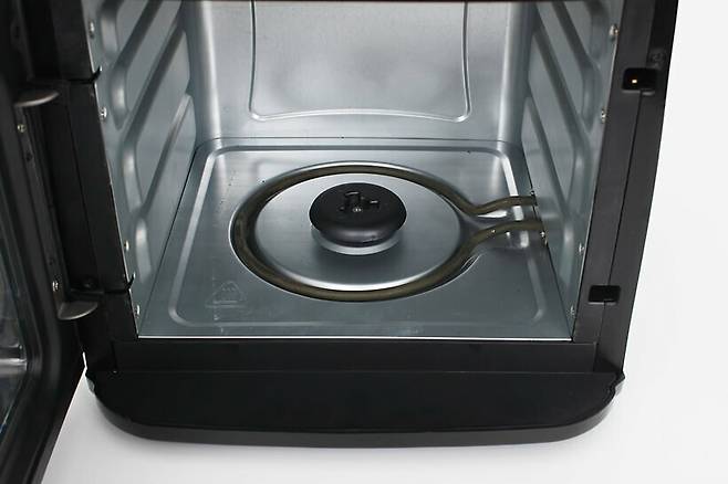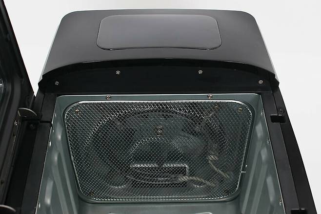 내부 윗부분을 보면 상단 발열관이 있고, 열풍을 불어줄 팬도 보인다. 상단 팬과 발열관에 식재료 등이 닿는 것을 방지하기 위해 촘촘한 철망이 설치되어 있다.