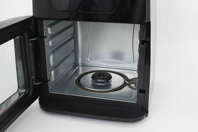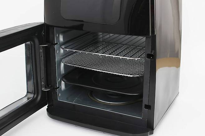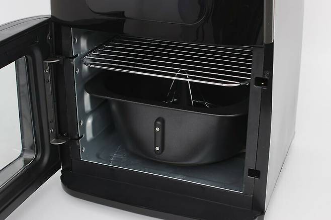 도어를 열면 널찍한 내부 공간이 나타난다. 전체 용량은 12L로, 많은 양의 식재료를 한 번에 조리할 수 있는 수준이다. 내부 측면에는 선반을 동시에 여러 개 수납할 수 있는 홈이 보인다.