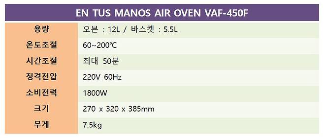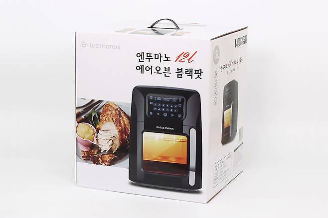 엔뚜마노 에어오븐 블랙팟 12L VAF-450F는 이중 박스 포장이 적용되어 있다. 겉박스는 갈색 골판지 재질을 사용했으며, 안쪽의 본 박스는 흰색 바탕에 컬러로 제품 이미지가 인쇄되어 있다.