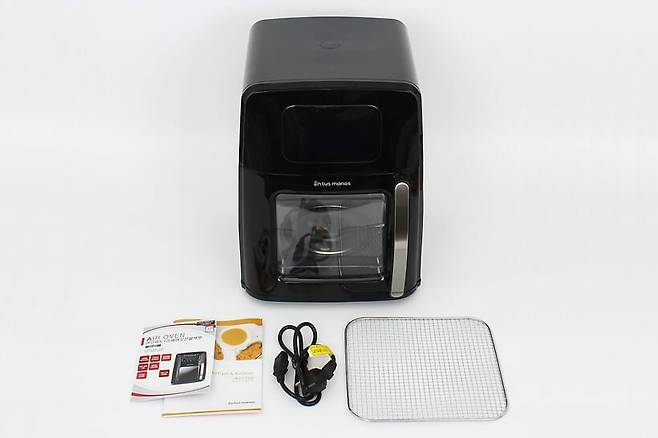 박스를 열면 스티로폼 완충재로 보호되어 있는 본체가 들어있다. 구성품은 에어오븐 본체와 그릴, 전원 케이블, 그리고 사용설명서와 레시피 가이드로 이루어져 있다.