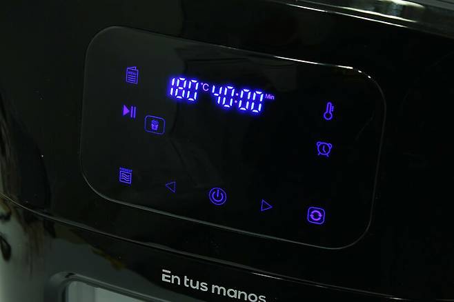 온도와 시간을 설정할 때는 디스플레이 오른편에 있는 온도계 표시와 시계 표시를 누르고 하단의 전원 버튼 양쪽에 있는 화살표를 눌러서 변경할 수 있다. 온도는 최소 60도에서 최대 200도까지 5도 단위로 조절할 수 있으며, 시간은 1분 단위로 최대 60분까지 설정 가능하다. 디스플레이 하단 양끝에는 예열 버튼과 회전 버튼이 있어서 예열 및 회전날 회전을 선택할 수 있다. 메뉴와 온도 및 시간 설정이 완료되면 왼쪽 메뉴 버튼 아래에 있는 시작 버튼을 눌러서 조리를 시작하면 된다.