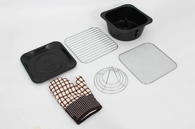 본체 안에는 더 많은 구성품이 들어있는데, 오일팬과 오븐팬 바스켓, 그릴, 치킨로스터, 그리고 오븐 장갑이 포함되어 있다. 그릴은 본체 안에 들어있는 것과 바깥에 추가로 들어있는 두 가지가 있는데, 하나는 한 방향으로만 철망이 있고 다른 하나는 가로세로 양방향으로 촘촘하게 철망이 있기 때문에 용도에 따라 골라 쓰면 된다.