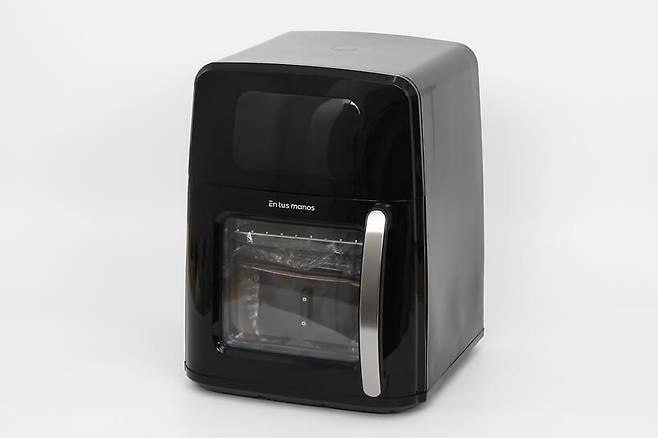엔뚜마노 에어오븐 블랙팟 12L VAF-450F의 전면 하단 도어에는 투명 유리창이 있어서 조리 시 도어를 열지 않고도 내부를 보며 조리 상태를 확인할 수 있다. 또한 오른편에 달린 큼직한 손잡이로 도어를 쉽게 여닫을 수 있다.