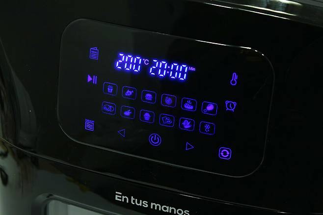 디스플레이 윗줄에는 설정 온도와 시간이 표시되며, 그 아래에는 감자튀김과 생선, 피자, 치킨 등 12가지의 자동메뉴 아이콘이 나열되어 있다.
