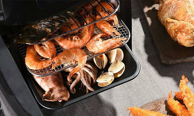 엔뚜마노 에어오븐 블랙팟 12L VAF-450F는 최대 3단으로 선반을 설치할 수 있어서 동시에 여러 요리를 할 수 있다. 오븐팬 바스켓을 사용할 경우 위쪽에 하나의 그릴을 더 얹을 수 있어서 두 가지 요리를 동시에 할 수 있다.