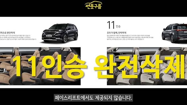 먼저 시트구성에 있어서 기존에는 가솔린 3.5와 디젤 2.2 엔진에 11인승이 제공되었습니다. 기본 9인승 차량 2열과 3열 중앙에 작은 시트를 추가한 것이 11인승인데요. 아무리 다인승 차량이라고 해도 11명이 동시에 이용하는 경우는 빈도수 자체가 낮고요. 이동하기에 불편하기 때문에 많이 이용하지 않았고요. 특히 4열은 승인을 위한 형식상의 공간이었죠. 그래서 페이스리프트에서는 11인승이 사라집니다. 모든 엔진에서 11인승 완전히 사라지고요. 하이리무진에서는 이전에도 제공되지 않았고요. 페이스리프트에서도 제공되지 않습니다.