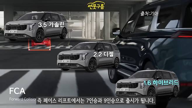 그럼 11인승이 꼭 필요하신 경우라면 대안이 있어야 되는데요. 스타리아 11인승을 이용하면 됩니다. 스타리아가 카니발보다 훨씬 큰 차량이죠. 특히 실내 공간을 나타내는 휠베이스의 경우 카니발보다 무려 185mm가 더 크기 때문에 실내공간도 훨씬 더 쾌적합니다. 11인승의 필요하신 경우라면 이차량을 이용하시면 될 것 같네요. 그럼 남은 건 7인승과 9인승 인데요. 먼저 엔진별 시트 구성을 알려드리면 3.5 가솔린, 2.2 디젤, 1.6 하이브리드 모두 동일한 시트로 구성이 됩니다. 즉, 페이스 리프트에서는 7인승과 9인승으로 출시가 됩니다.
