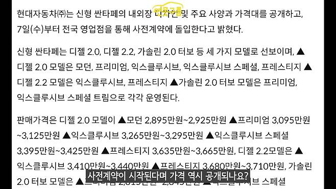 세 번째는 가장 궁금한 '11월 8일의 사전계약이 시작된다며 가격 역시 공개되나요?' 가격 공개에 대한 제조사의 공식 입장이 현재까지 파악되지 않았는데요. 그래서 이건 지금까지 공개된 방식에 대해서 알려드립니다. 통상적으로 가격대는 사전계약시에 가격 범위가 노출되는데요. 지금 보시는 화면이 최근 출시된 신형 싼타페의 사전계약 내용인데요. 판매가격 범위가 나오죠. 그리고 이후에 최종 확정된 가격을 알려줍니다.