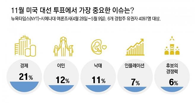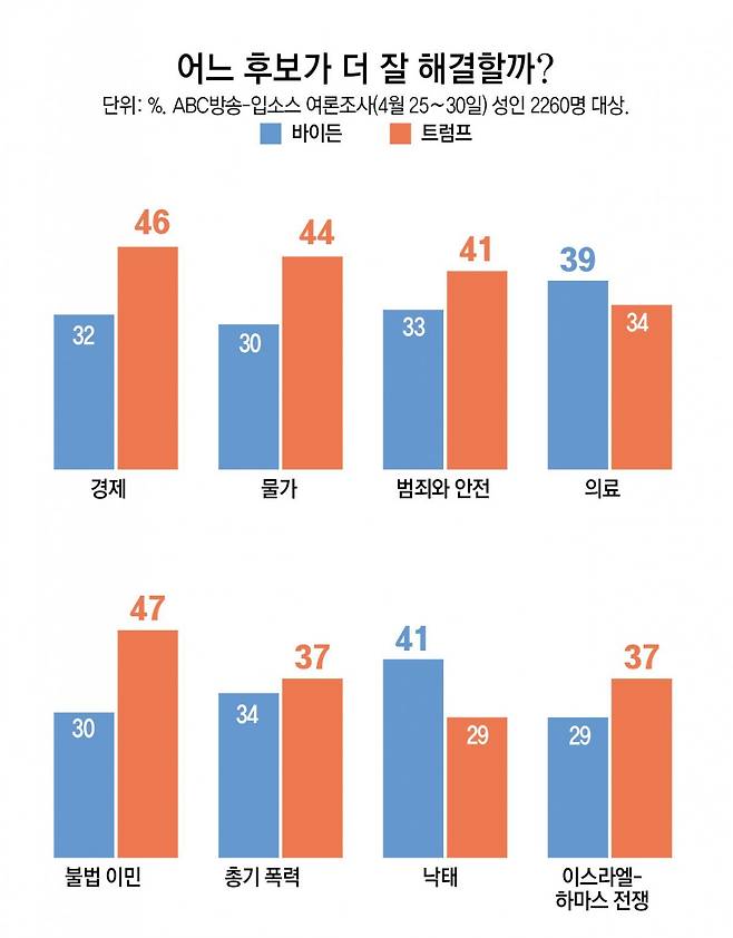 현재 대부분 여론조사에서 경제, 특히 인플레이션은 미 유권자에게 가장 중요한 이슈다. 올 들어 미 증시 벤치마크인 스탠더드앤드푸어스(S&P)500지수는 20차례 이상 최고치를 경신했고, 글로벌 경제학자들은 미 경제 성장세에 박수를 보내고 있다. 하지만 실제 현지 미 국민들은 고물가를 비롯한 경제 전반에 대한 불만이 높다.
