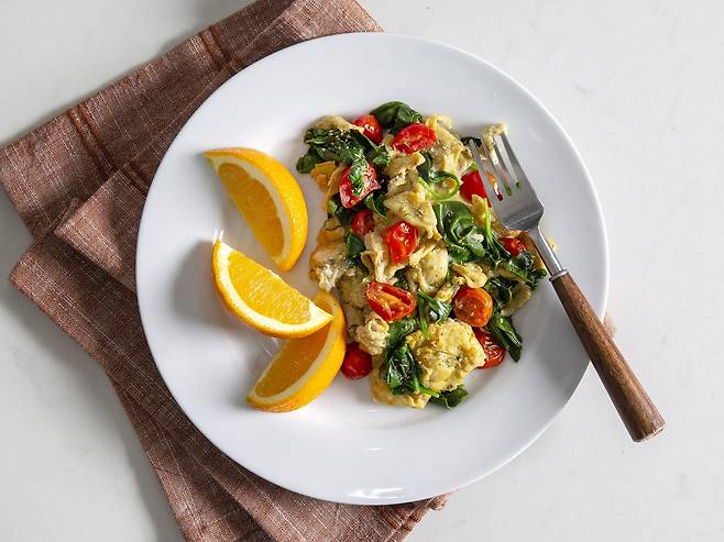 계란은 완전식품이지만 다른 식품과 결합할 때 영양 흡수력과 기능이 크게 강화된다. 토마토뿐 아니라 시금치, 아보카도, 버섯도 계란과 최고의 궁합을 이루는 조합이다.