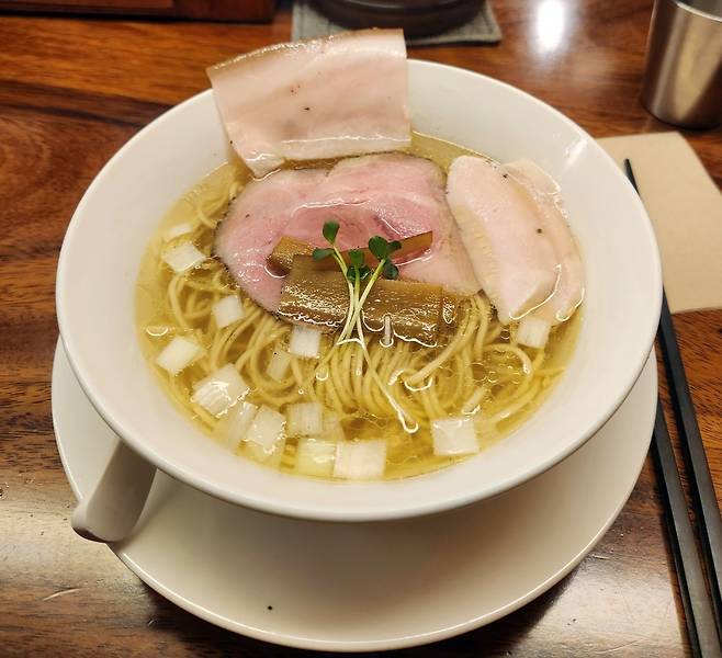 시오라멘이 나왔다. 기름이 살짝 뜬 투명하고 맑은 국물에 면 사리가 얌전히 담겼다. 고명은 돼지고기 차슈와 닭가슴살, 그리고 죽순 두 조각. 계란을 별도로 주문할까 하다가 일단 참았다. 기본 메뉴 본연의 맛이 우선이다.