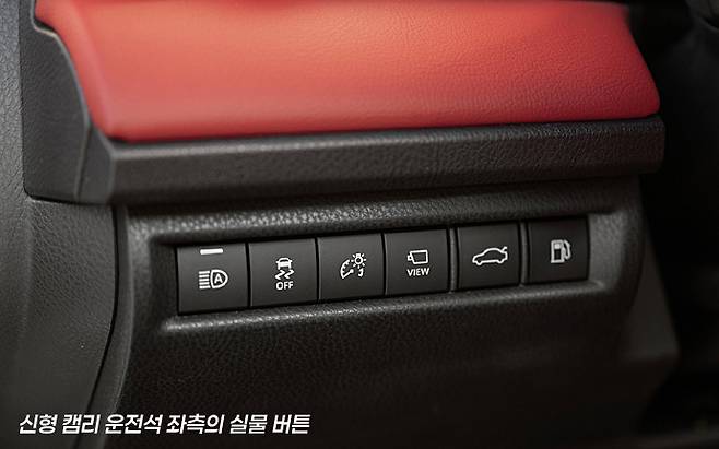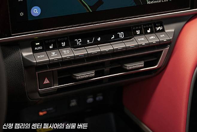 그런 맥락에서 인스트루먼트 패널을 비롯한 실내 공간은 고급스러움보다는 대량생산된 공업제품의 특징을 보여줍니다. 그리고 또 눈에 띄는 건 센터 페시아의 물리적 버튼의 설치입니다. 요즈음에는 거의 대부분의 신형 차들이 디지털 기술에 의한 터치 디스플레이 기능의 적용으로 물리적 버튼이 사라져 가고 있지만, 캠리는 운전 중에 자주 조작해야 하는 공조장치 버튼을 물리 버튼으로 설치해 놓았습니다.