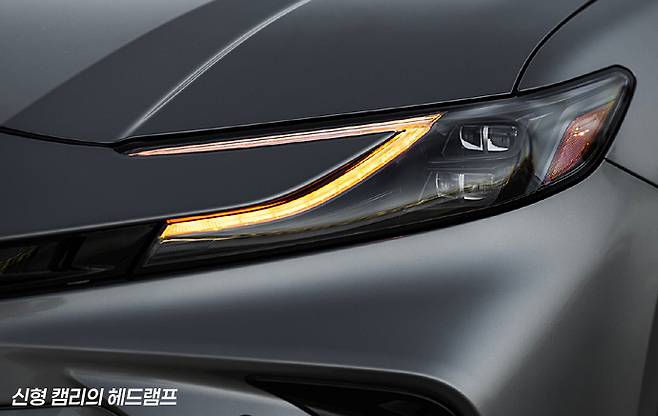 새로 등장한 9세대 캠리 모델의 디자인은 전체적으로는 무난한 중형 세단의 이미지를 풍기지만, 세부적인 형태는 무난하지 않은 인상입니다. 먼저 눈에 띄는 모습은 토요타가 해머 헤드라고 밝힌, 마치 망치 상어의 머리 같은 이미지가 헤드 램프에 있는 마주 보는 디귿(ㄷ) 형태의 램프에 의해 형성됩니다.