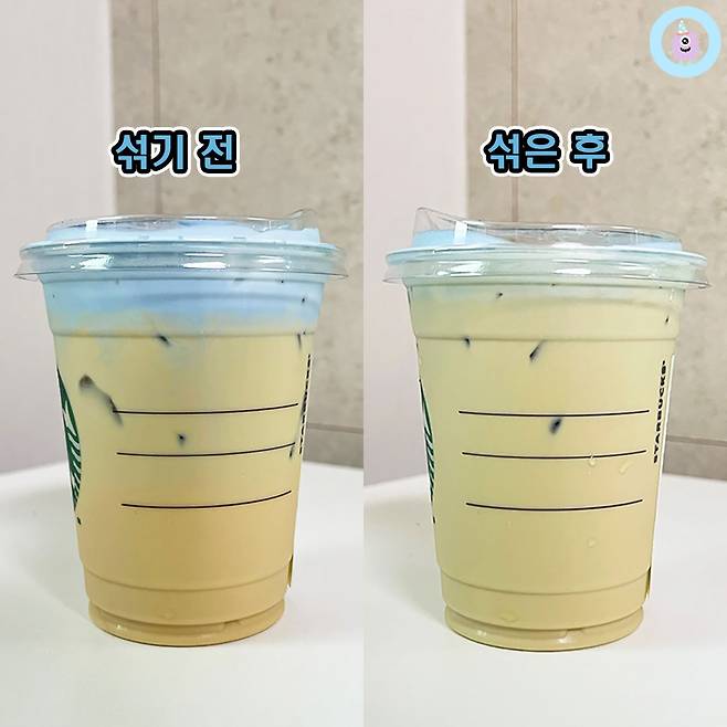 구성은 정말 간단합니다. 푸른 용 헤이즐넛 라떼와 똑같이 치자로 색을 낸 푸른색 거품이 올라가 있고, 아래엔 클래식 밀크티가 담겨있어요.