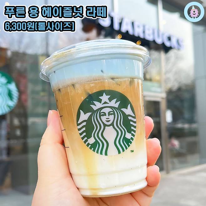 비주얼만 봤을 때 더 기대됐던 <푸른 용 헤이즐넛 라떼>부터 마셔봤어요! 가격은 톨사이즈 기준 6,300원이었고 ICE와 HOT 모두 가능한 메뉴였습니다. 칼로리는 톨사이즈 기준 265Kcal이고 카페인은 150mg 함유되어 있어요.