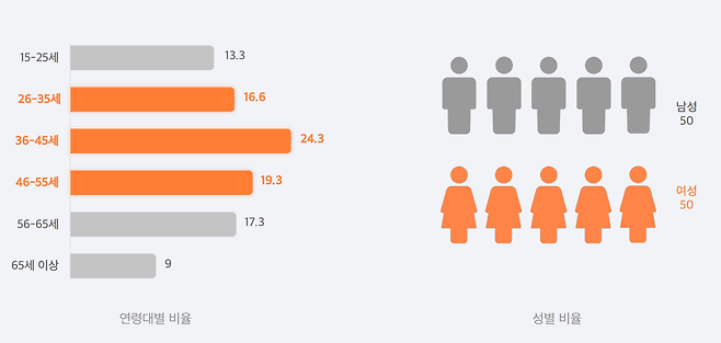 유저의 연령대도 10대부터 60대 이상까지 폭넓게 분포하고 있는데, 그 중 26세 이상부터 55세 이하의 유저 분포가 특히 높은 편이지. 핵심 소비층 연령대 유저의 분포가 높은 편이기 때문에, 더욱 효과적인 광고 성과를 기대해 볼 수 있는 부분이야💸