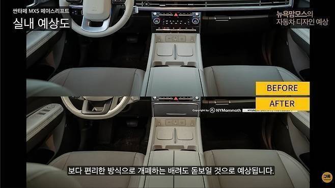 새로운 센터페시아 디자인에 따라 송풍구의 위치도 대폭 변경됐다. 기존 모델에서 디스플레이 상단과 측면에 배치됐던 송풍구들이 더욱 효율적인 위치로 재배치됐다. 특히 현행 싼타페의 특징이었던 대시보드를 가로지르는 얇고 긴 라인형 송풍구가 완전히 사라진 것이 눈에 띈다.