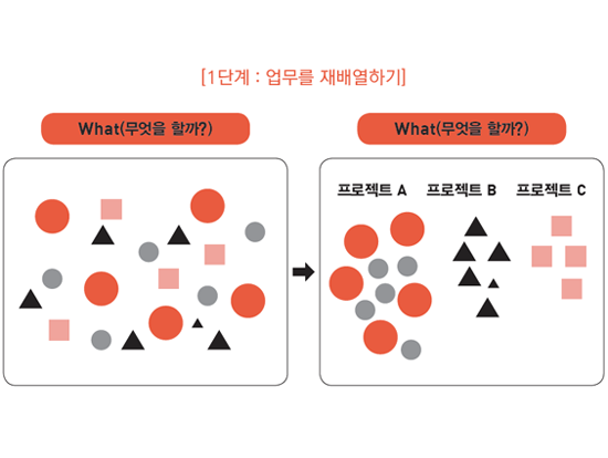 먼저 포스트잇과 화이트보드를 준비합니다. 화이트보드에 기존 사업의 큰 묶음(굵직한 사업목표 또는 목표 프로젝트)을 제목으로 쓰고, 아래에 이미 했거나 해야 할 업무들을 적습니다. 아직 사업계획을 세우기 전이라면 작년 실적 기술서를 참고해서 적으면 됩니다.