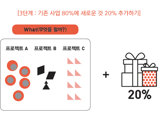 새로운 것 20%를 추가할 때는 자잘한 걸 늘리기보다는 핵심 WHAT을 돋보이게 할 큼직하고 눈에 띄는 프로젝트를 1~2개 추가하는 것이 좋습니다. 주의할 점은 20%를 늘리라는 것이 새로운 사업을 시도하라는 의미이지, 양을 늘리라는 의미는 아닙니다. 연간 열 번 하던 채용상담회를 열두 번 한다고 해서 20% 새로운 걸 추가했다고 생각하는 사람은 아무도 없답니다.