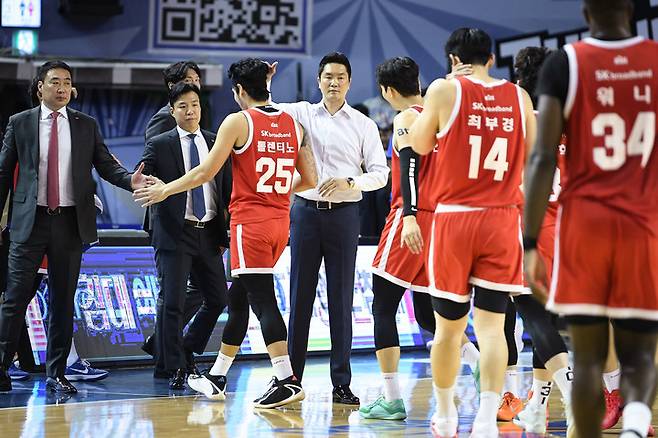 SK는 17일 서울 잠실실내체육관에서 열린 2025-2026 LG전자 프로농구 정규리그 원정 경기에서 서울 삼성과 'S-더비'에서 82-79로 신승을 거뒀다.