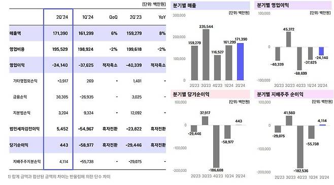 - 2024년 2분기 영업이익 -241억 원(전기 적자축소, 전년 적자축소) ㄴ2개 분기 연속 전분기 대비 영업손실 규모 감소, 주가 변동에 따른 전환사채 관련 파생상품평가이익 발생 등 영향으로 당기순이익과 지배주주지분순이익 모두 전분기 대비 흑자 전환