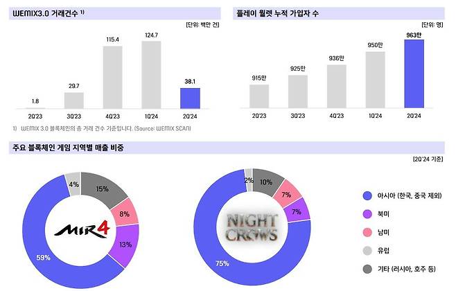 ● 2024년 신작 및 사업 계획 - 신작 '레전드 오브 이미르(Legend of YMIR)'에 독자적인 블록체인 기술 접목하며 개발 박차, 3분기 국내 출시 목표 - '미르M' 중국 판호 획득 완료 후 중국 더나인과 퍼블리싱 계약 체결 - '미르4' 중국 37게임즈와 퍼블리싱 계약 체결, 현재 판호 획득을 위한 작업 돌입 중 - 하반기 ‘위믹스 플레이’와 ‘위믹스 페이’를 선보이며 위믹스 생태계 확장을 위한 노력을 가속화할 방침 - 블록체인 기반 소셜 플랫폼 ‘위퍼블릭’ 의사결정과 자금흐름의 투명성, 신뢰도를 높이기 위한 시스템 도입 추진
