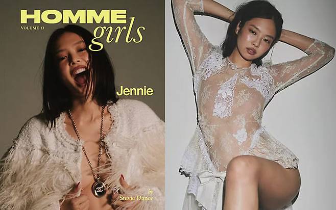 이번 화보에서 제니는 상반신 노출과 시스루 의상으로 관능적인 매력을 발산했습니다. 그는 소품으로 주요 부위만 가린 채 포즈를 취하거나 맨몸에 퍼 재킷을 걸치고 가슴선을 드러냈습니다.