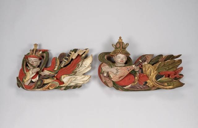 ‘목제주악비천여신상’을 보면 목제의 둔탁함 대신 옷자락이 바람에 휘날리는 듯한 유려함이 느껴집니다. 주악비천은 지금 피리와 비파를 연주하고 있는데 그 소리는 속세에서는 들을 수 없을 정도로 아름답고 황홀합니다. 주악비천의 악기는 연주하지 않아도 스스로 울리는 신비스러운 물건이고 들고 있지 않아도 허공에 저절로 매달려 있다고 합니다. 그들은 천의무봉의 악기를 연주하며 부처님의 장엄함과 훌륭함을 찬탄합니다. 서양의 예수님과 동양의 부처님은 인류문화를 풍요롭게 꽃피게 만든 양대 축입니다.