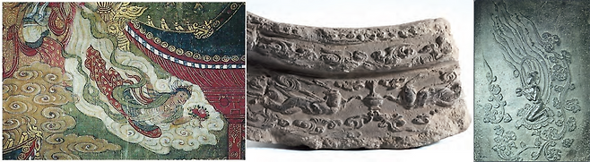 인간은 하늘을 날 수 없습니다. 할 수 없는 것은 동경의 대상이 됩니다. 높은 하늘을 자유롭게 날아다니는 새를 보며 견우와 직녀 설화를 만들었습니다. 죽은 사람의 영혼을 저승세계까지 안내한다는 상상 또한 새에 대한 동경에서 시작됐습니다. 날고 싶은 욕망은 새뿐만 아니라 구름을 볼 때도 계속됐습니다. 만약 사람이 구름을 탄다면 새가 되지 않더라도 어디든 원하는 곳까지 날아갈 수 있지 않을까요? 이런 엉뚱한 발상에서 탄생한 존재가 비천입니다.