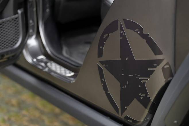 이 패키지는 후드와 도어 사이드 바디에 군용차를 연상시키는 거친 질감의 별 모양 데칼이 적용되어 눈길을 끌며, 무광의 새틴 블랙 그릴을 포함하여 터프하고 강인한 외관을 완성했다.