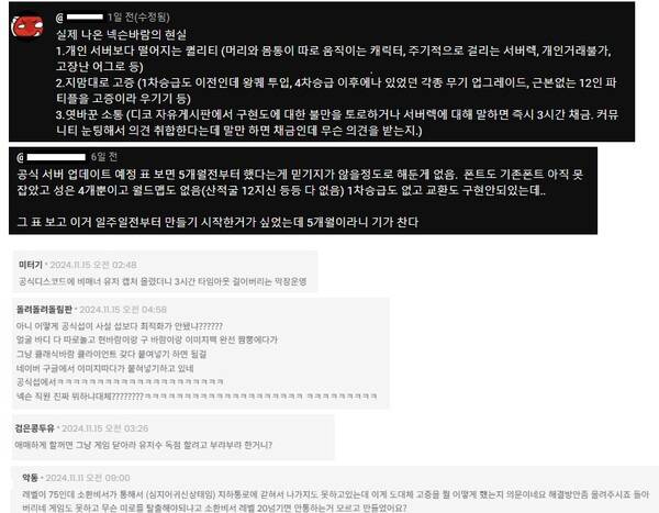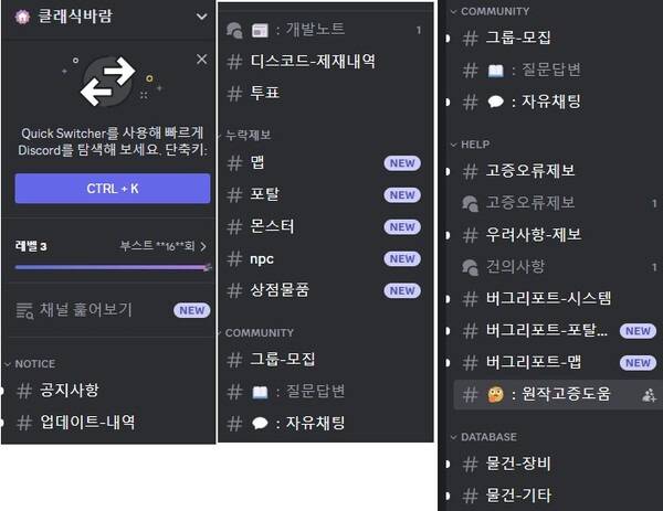 '바람의 나라' 11개의 성을 모두 구현하며 2003년 버전의 '바람의나라'를 그대로 살리는 고증에도 공을 들였다. 소통의 양과 질도 다른 모습이다. '클바' 크리에이터는 유저들이 주제별로 의견을 개진할 수 있도록 카테고리를 세밀화했다. '클바'의 디스코드는 △누락 제보 △고증오류 제보 △오류 사항 제보 등으로 유저의 피드백을 취합하는 한편 △원작 고증에 대한 도움으로 유저들과 함께 완성도를 높이고 있다.