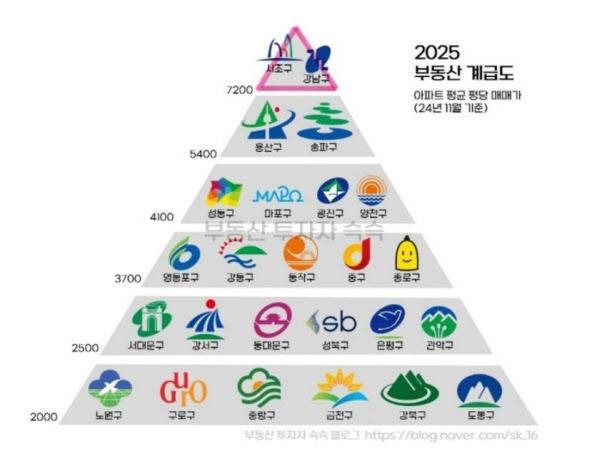 최근 부동산 관련 글을 게재하는 블로거가 만든 서울 부동산 계급도가 온라인 커뮤니티상에서 화제를 모으고 있다. ‘부동산 투자자 슥슥’이라는 블로그에는 2024년 11월 각 지역 대장 아파트 호가를 기준으로 피라미드형 부동산 계급을 매긴 글이 업로드 됐다.