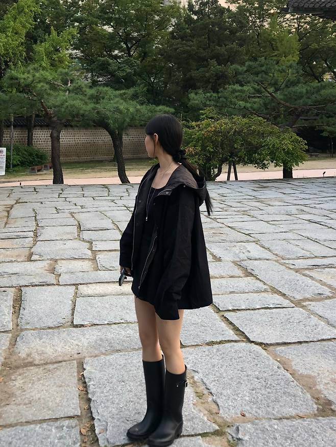 베이지가 키치했다면, 블랙은 짧은 하의에 부츠를 매치해서