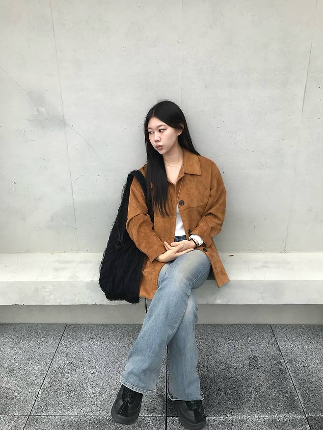 긴 부츠컷 데님과 매치하면 조금 더 차분하고 성숙한 분위기를 낼 수 있어요.