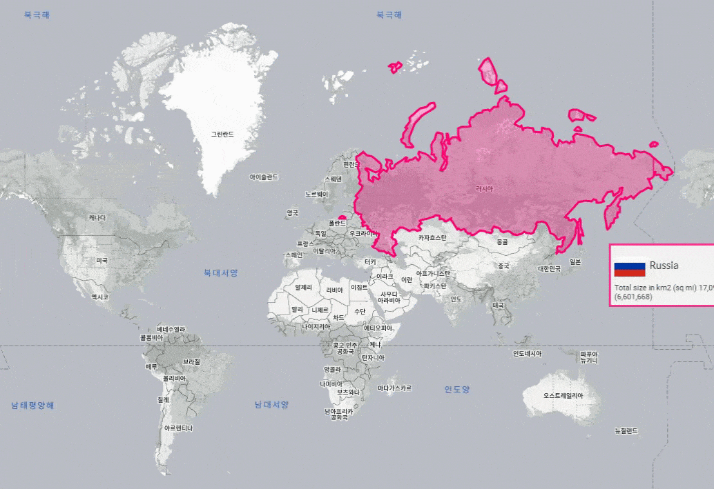 메르카토르 도법에 등장하는 나라의 ‘실제 크기’를 보다 직관적으로 비교해볼 수 있는 사이트를 소개합니다. 미국인 프로그래머인 제임스 탈매지와 데이먼 매니스가 만든 ‘더 트루 사이즈(thetruesize)’입니다. 검색창에 국가 이름을 입력하면 드래그가 활성화되는데요. ‘러시아’를 입력하고 적도 부근으로 끌고 오니 크기가 확 작아지는 것을 확인할 수 있습니다.
