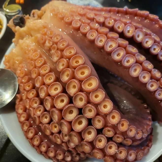 하지만, 아직 메인 메뉴는 도착도 하지 않았다. 한참 배를 채우고 있으면 어항에서 커다란 '문어'를 건져 오신다. 뜨거운 물에 그대로 입수 시킨 후에, 맛있게 익으면 그제서야 상으로 서브 된다. 다리 하나만 먹어도 배부를 정도로 큼지막한 사이즈의 '문어 숙회'는 한 점, 한 점 마다 저절로 술로 손이 향하게 만든다.
