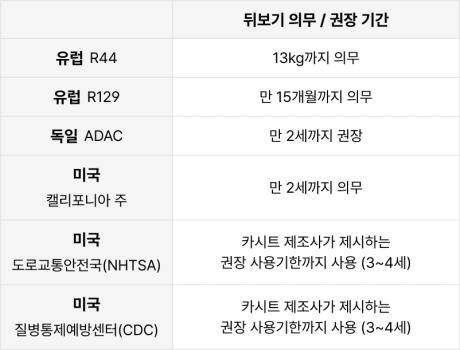 특히 유럽의 안전규정을 살펴보면, R44 규정에서는 체중 13kg(약 24~30개월), R129 i-size규정에소는 15개월간 뒤보기를 사용하도록 규정하고 있습니다.