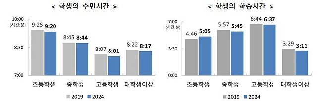 학생들이 학교에서 공부하는 시간은 초등학생에서만 유일하게 증가했다. 나머지 중학생, 고등학생, 대학생 이상의 학교활동 학습시간은 줄었다. 학교 밖에서 하는 공부시간은 대학생 이상에서만 감소했다.