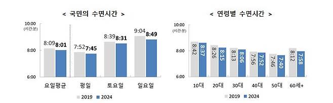 수면 시간은 모든 연령층에서 감소했다. 10~19세는 2019년 8시간 43분에서 지난해 8시간 39분으로 줄었다. 같은 기간 20~29세는 8시간 27분에서 8시간 17분, 30~39세는 8시간 14분에서 8시간 7분, 40~49세는 7시간 57분에서 7시간 54분으로 감소했다. 50~59세도 7시간 48분에서 7시간 42분으로, 60세 이상은 8시간 18분에서 8시간 5분으로 줄었다. 평균 취침 시각은 오후 11시 28분으로, 기상 시각은 6시 59분이다.