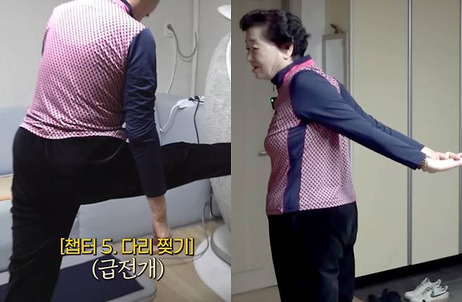 이어 장윤주 어머니는 안마 의자에 다리를 올려 스트레칭을 하는 등 체조를 선보이기도 했다.